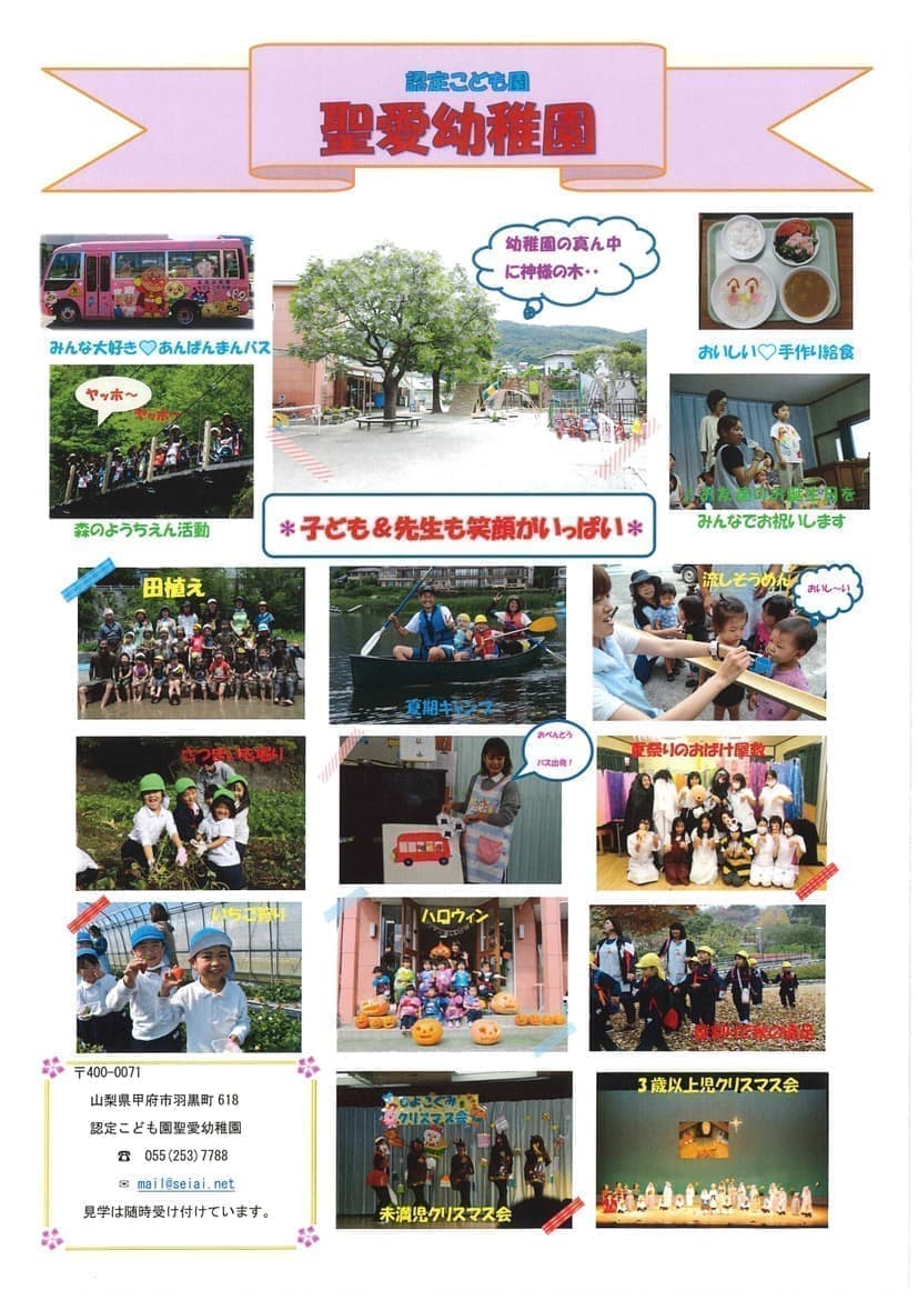 甲府市の北部にあり、緑の山々に囲まれた自然豊かな幼稚園です。キリスト教精神に基づいたアットホームな幼稚園。少人数クラス、縦割り活動を導入し、一人一人に対応した保育を目指しています。6年前に認定こども園に移行して幼稚園機能に加え、保育園型の子ども・保護者を支援しています。本物との出会いを大切にして農業活動、自然活動、音楽活動、英語、体操、スイミング、森のようちえんプログラムを積極的に取り入れて子どもたちの育ちをサポートしています。また手作り給食でアレルギー対応はもちろん豊富な食材で調理した給食で食育を進めています。