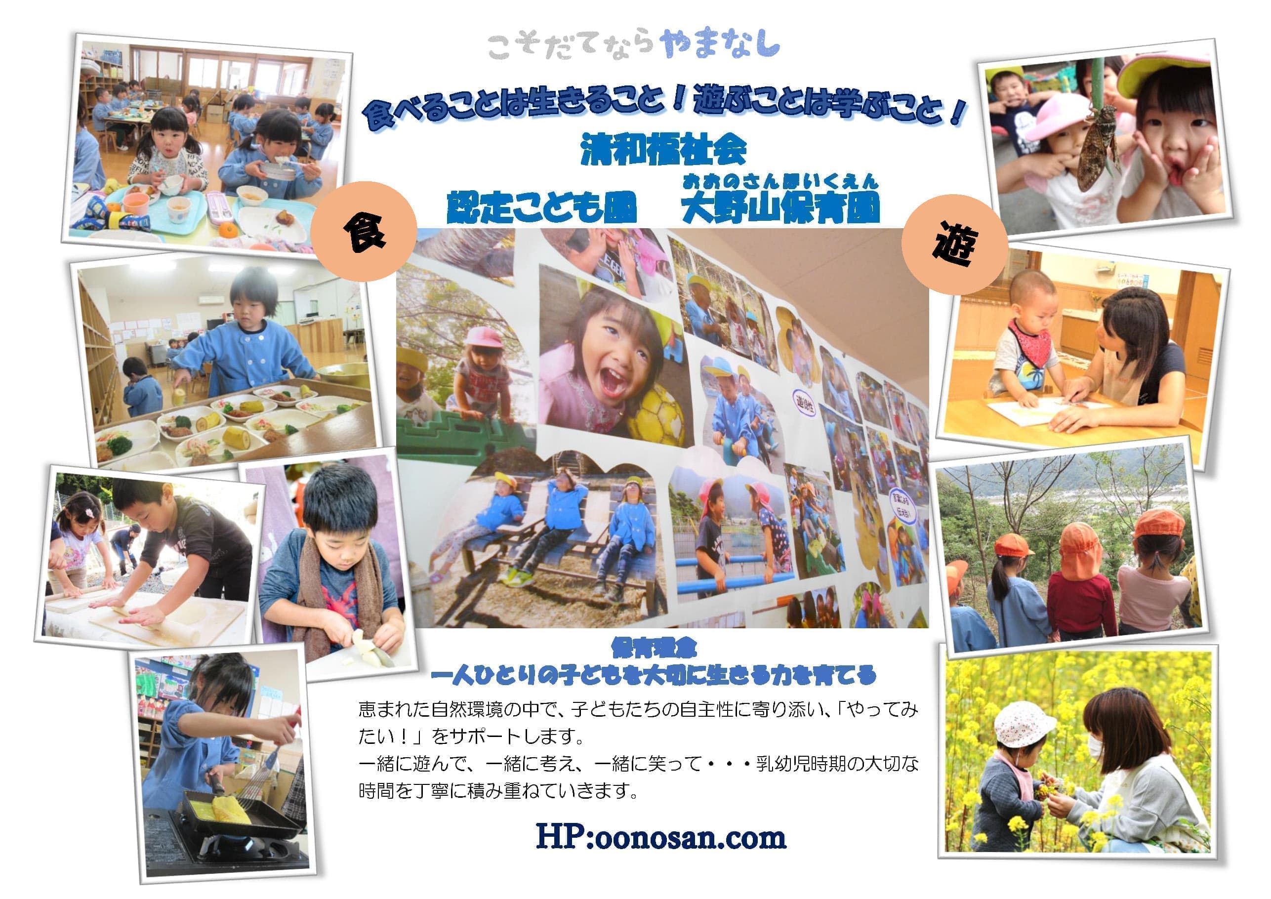 誰もが生まれながらに持っている“生きる力”。安心感の先にある意欲の芽生えを大切に育み、子どもたちの「やってみたい!」を大切に毎日過ごしています。0.1.2歳児では、子ども2~3人に1人の保育士が担当制で関わり、子どもたちの不安感を取り除くまで丁寧に寄り添い、愛着と信頼を育てます。3.4.5歳児では、異年齢保育を基本とし、あそびに夢中になれる時間の確保と環境を整え、複数担任で関わっています。常に子どもが中心であることを忘れず、職員全員で子どもたちの「やってみたい!をサポート!!また、職員間での話し合いやコミュニケーションを大切にし、保育に反映できる体制作りに取り組んでいます。2017年やまなし食の安全・安心優良活動山梨知事表彰受賞/令和元年度山梨県自然保育活動知事表彰受賞